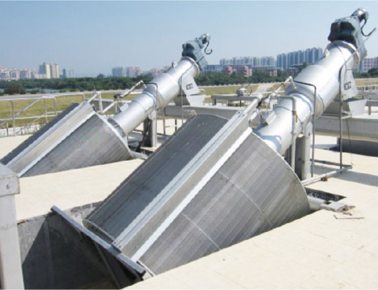 该设备采用转鼓螺旋式,由圆形筛筒作为栅面,与水平面成35°安装在水渠中,当污水从格栅端头流入筛筒内,大于栅隙的滤渣被拦截,沉积在筛筒内表面,整个筛筒由电机驱动旋转,筛筒上方的清渣刷与冲水机构对筛面进行清洗,将滤渣冲落入中央物料槽内,由输送螺杆提升,经压榨、脱水后,由卸料口落入物料箱或输送机进行外运处理。