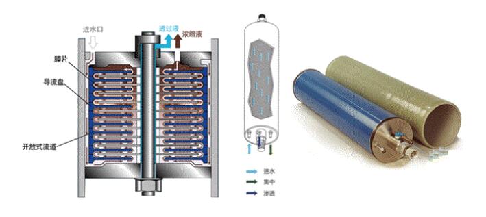 DTRO膜组件具有特殊的流道设计形式,采用开放式流道,料液通过增压泵经进料口打入DTRO膜柱内,从导流盘与外壳之间的通道流到组件的另一端,在另一端法兰处,料液通过8个通道进入导流盘中被处理的液体以较短的距离快速流经过滤膜,然后180度逆转到另一膜面,再从导流盘中心的槽口流入到下一个导流盘,从而在膜表面形成由导流盘圆周到圆中心,再到圆周,再到圆中心的双”S”形路线,浓缩液较后从进料端法兰处流出。
